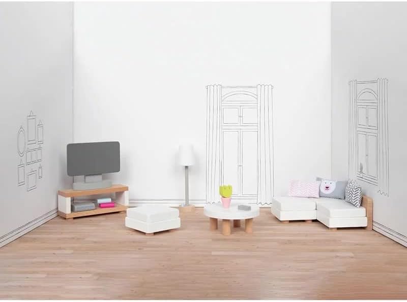 Die Sicherheit Ihrer Kinder steht bei diesem Puppenmöbel Style Wohnzimmer-Set an erster Stelle. Jedes einzelne Teil wurde mit größter Sorgfalt aus robustem Holz und hochwertigen Textilien gefertigt, um ein langlebiges Spielerlebnis zu garantieren. Die verwendeten Farben auf Wasserbasis sind selbstverständlich ungiftig und entsprechen höchsten Sicherheitsstandards, sodass Eltern beruhigt zusehen können, wie ihre Kleinen in fantasievolle Welten eintauchen. Die Verarbeitung jedes Möbelstücks zeugt von handwerklicher Präzision und Liebe zum Detail – von der akkurat gearbeiteten Miniatur-Couch bis hin zum maßstabsgetreuen Fernseher im Maßstab 1:12. Durch die robuste Konstruktion hält das Set auch intensiven Spielsessions stand und begleitet Ihr Kind über viele Jahre hinweg. Die Größe der einzelnen Teile ist perfekt auf Kinderhände abgestimmt, sodass auch die feinmotorischen Fähigkeiten spielerisch gefördert werden, während die kleinen Puppenhausbewohner in ihrem neuen Wohnzimmer eingerichtet werden.