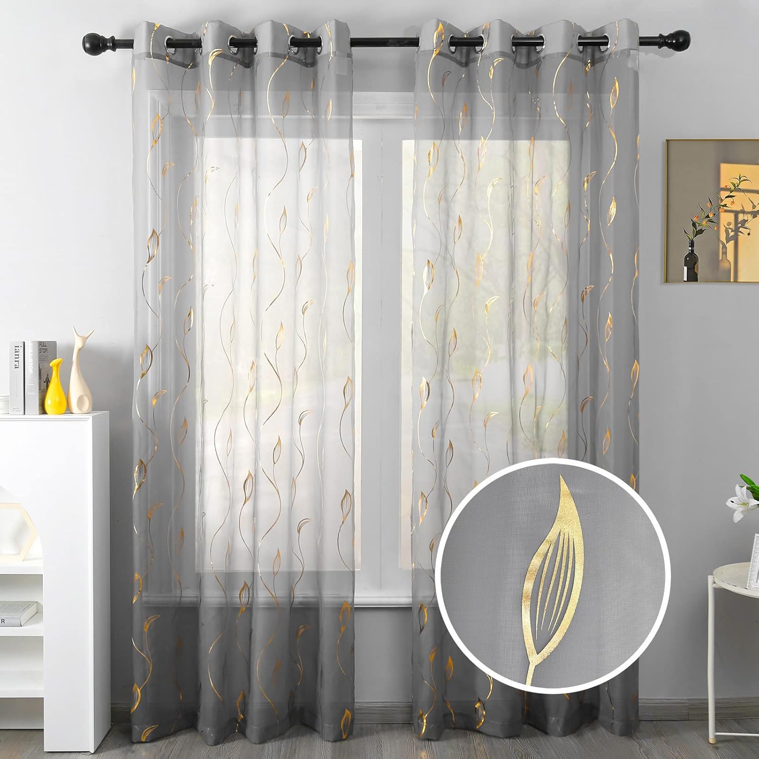 Entdecken Sie die zauberhafte Welt der youleyar durchsichtigen Voile-Vorhänge mit exquisitem Goldfolien-Druck, die Ihrem Zuhause eine völlig neue Dimension verleihen. Diese luxuriösen Fenstervorhänge mit einer Länge von 244 cm vereinen Funktionalität und ästhetische Eleganz auf einzigartige Weise. Das halbtransparente Polyestergewebe schafft die perfekte Balance zwischen Lichtdurchlässigkeit und Sichtschutz - ein Spiel aus Licht und Schatten, das Ihre Räume in eine warme, einladende Atmosphäre taucht. Die beiden Vorhangpaneele mit jeweils 132,1 cm Breite bieten zusammen eine großzügige Abdeckung für Standardfenster und sorgen mit ihrem durchdachten Design für einen harmonischen Gesamteindruck. Das filigrane Blättermuster mit goldenen Akzenten verleiht jedem Raum einen Hauch von Luxus und zeitloser Eleganz, ohne dabei aufdringlich zu wirken. Die hochwertigen Flechtösen in mattem Silber fügen sich nahtlos in das Gesamtbild ein und ermöglichen eine problemlose Anbringung an Gardinenstangen bis zu 3,8 cm Durchmesser.